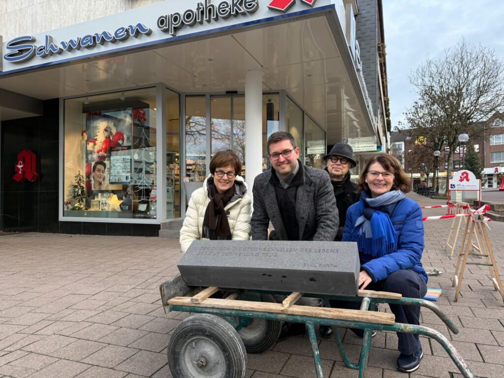 Direkt vor der Schwanen-Apotheke der nächste Emil-Barth-Stein. Das Zitat passend zum Thema Gesundheit. Unternehmerin und Apothekerin Dr. Ulrike Peterseim ermöglicht den 14. Zitatstein des Projekts auf dem Neuen Markt als Zeichen der Verbundenheit der Apothekentradition ihrer Familie zu Emil Barth und seinem Haan.