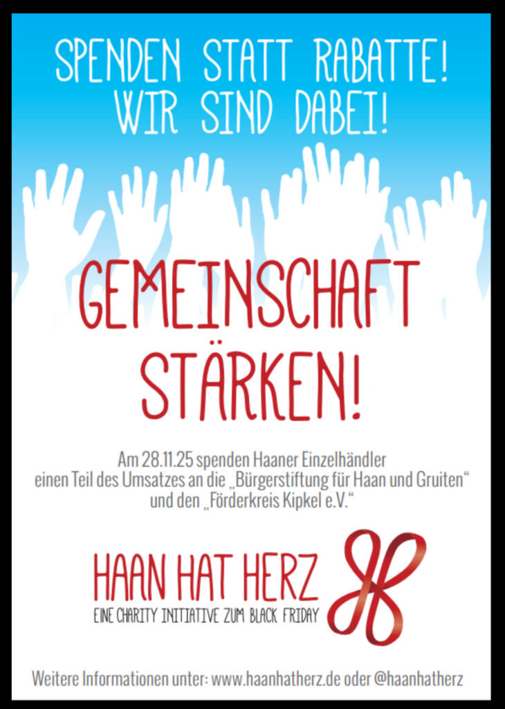 Zum „Black Friday“ am 28.11. spenden Haaner Einzelhändler einen Teil des Umsatzes an die Bürgerstiftung und den Förderkreis Kipkel e.V. Das ist eine tolle Aktion und wir bedanken uns sehr dafür. Hier ist die Website dazu.
