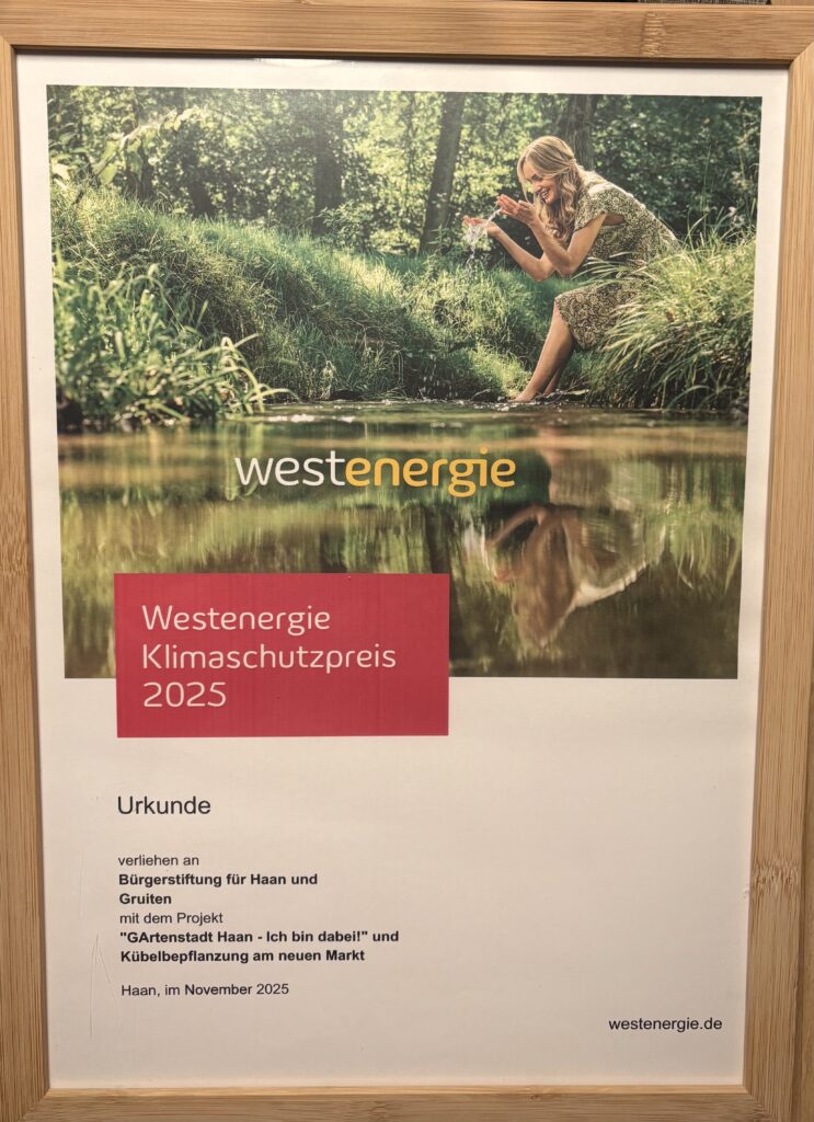 Wir haben den 1. Platz beim Klimaschutzpreis der Westenergie erhalten. Dieser wurde gemeinsam mit der Stadt Haan ausgewertet und im Rathaus verliehen. Mit unserer Projektgruppe „Klima Arten und Umwelt“ hatten wir uns mit unseren Projekten der Mitmachschilder sowie der Kübelbepflanzung am Neuen Markt beworben. Dotiert ist der Preis mit 1.250,00 €. Vielen Dank