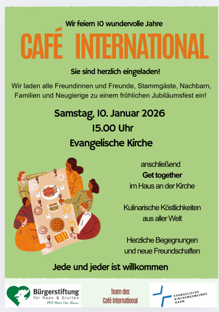 Am 10.1.2026 feierte das Café International 10-jähriges Jubiläum. Es war ein schönes Fest, beginnend mit einer Messe in der evanglischen Kirche und anschließend mit einem „Get together“ im Haus an der Kirche. Vielen Dank an alle Helferinnen und Helfer, die geholfen haben, diesen Tag so wunderbar zu machen.