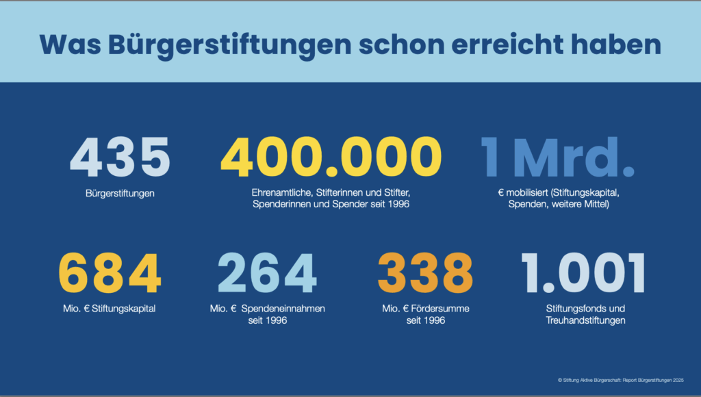 Wir sind eine von 435 Bürgerstiftungen in Deutschland. Insgesamt werden wir seit 1996 von etwa 400.000 Menschen getragen und etwa 100.000 Menschen in Deutschland haben sich bereits ehrenamtlich in Gremien oder Projekten engagiert.